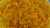 Krok 4: Dýni nahrubo nastrouháme, prosypeme cukrem a nasypeme na těsto ve formě. Z másla, cukru a mouky připravíme žmolenku, kterou posypeme nastrouhanou dýni.