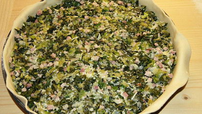 Na těsto ve formě naneseme rovnoměrně připravenou náplň. Zbylé těsto tence vyválíme tak, aby zakrylo celou formu. Okraje obou placek bříšky prstů spojíme do pomyslné vlnovky. Povrch koláče propícháme nožem, aby z koláče mohla unikat pára a celý potřeme rozpuštěným sádlem. Krok 5: Formu s koláčem vložíme doprostřed trouby vyhřáté na 200 °C. Pečeme 35 minut a na posledních 5 minut zapneme horkovzduch. Po upečení se koláč lehce odlepí od formy a po částečném vychladnutí lze přendat na velký talíř. Stačí ho jen podebrat obracečkou a on sám z formy sklouzne na talíř. Koláč krájíme ostrým nožem.