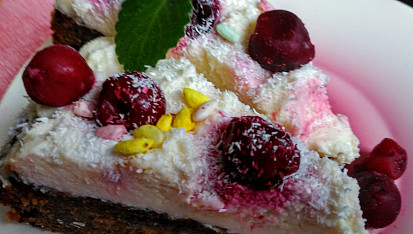 Vychladlý korpus potřeme a nazdobíme tvarohovo-máslovým krémem. Dozdobíme višněmi bez pecek. Posypeme kokosem.