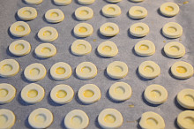 Nejprve vykrojíme plná kolečka a potřeme je vejcem.