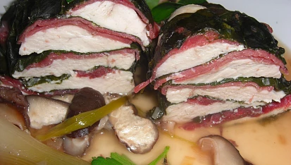 Kuřecí prsa v bresaole a špenátových listech dušená s houbami shitake a pórkem