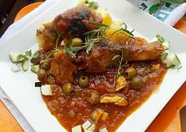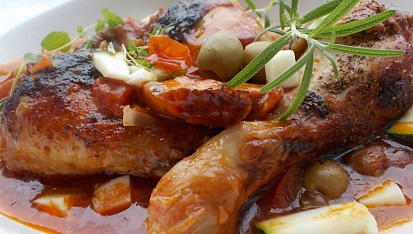 Maso ze všech stran opečeme, zalijeme bílým vínem a podusíme. Krok 3: Kuřecí maso přendáme do pečící nádoby. K masu vložíme rozkrojenou palici česneku, zelené okapané olivy a okořeníme pepřem. Krok 4: Loupaná rajčata rozmačkáme (nebo rozmixujeme) na hustou směs, kterou nalijeme na kuřecí maso s olivami. Přidáme špalíčky cukety. Promícháme. Krok 5: V rozehřáté troubě pečeme na 180 stupňů cca 35 minut. Podáváme s bramborem nebo s těstovinami.