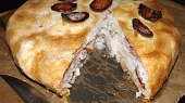 Krok 4: Vezmu plech. Přeložím pečící papír a položím na hrnec. Nyní přijde chvíle pravdy. Vezmu plech i s hrncem a otočím ho. Kurnik mi hezky vypadne na plech a já ho vrazím do vyhřáté trouby upéct. Vrch elegantně okrášlím plátky klobásky.