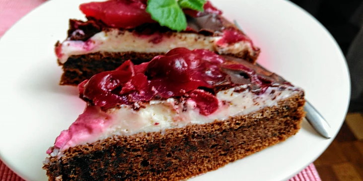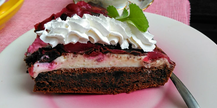 Dortík s krémem z lučiny (doma zhotovené) s višněmi a polevou