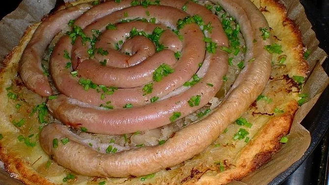 koláč plněný vinnou klobásou,