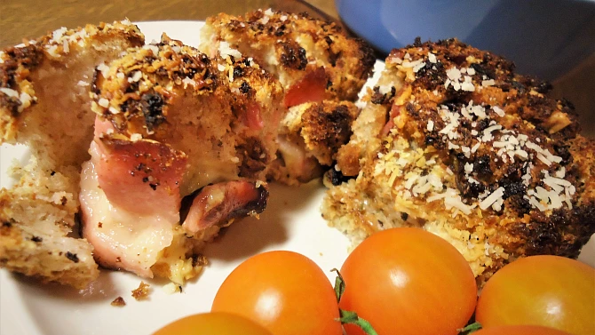 Krok 2: Pomocí papíru zamotáme roládky, ty pak uprostřed překrojíme. Půlky rolád trošku ztvarujeme v ruce (celozrnný chleba se docela drobí) a řezem nahoru pokládáme vedle sebe do menší zapékací misky, vymazané sádlem.