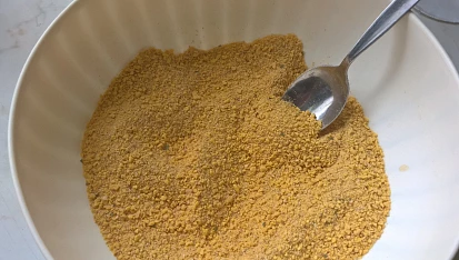 Krok 3: Rozdrtíme kukuřičné lupínky a přidáme lžíci strouhanky. Přidáme grilovací koření a promícháme. Pokud je grilovací koření bez soli, můžeme přidat i sůl. Množství volíme podle chuti. Směs ochutnám a případně dokořením.