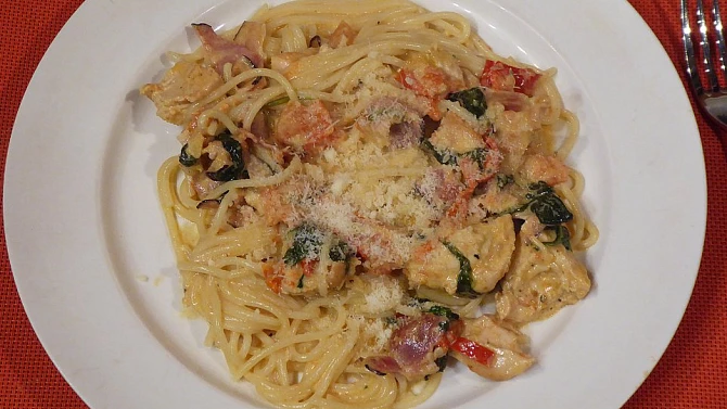 Kuřecí prsa v krémových špagetách