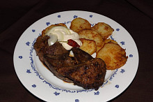 Anglická vepřová játra s bramborovými dukátky a tatarskou omáčkou