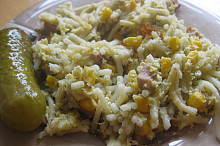 Špagety zapečené s měkkým salámem, hráškem a kukuřicí