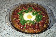 Zapečená čočka s párkem a vejcem