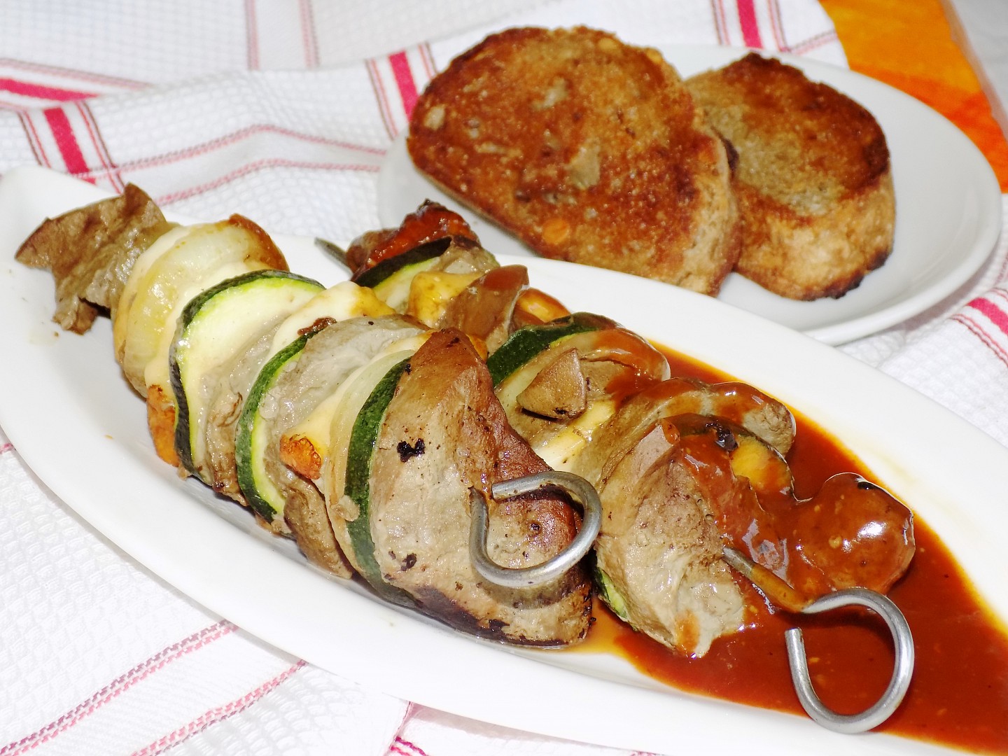 Krok 2: Pečeň, syr, cibuľu a cuketu striedavo napichujeme na ihly.