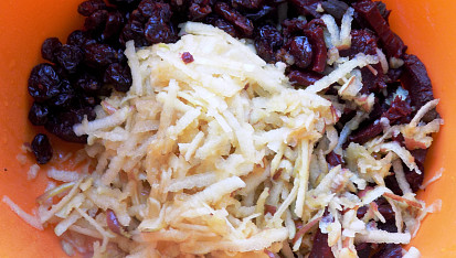 Krok 1: Cviklu nakrájame na tenšie kolieska, pridáme nahrubo nastrúhané jablko a brusnice. Premiešame.