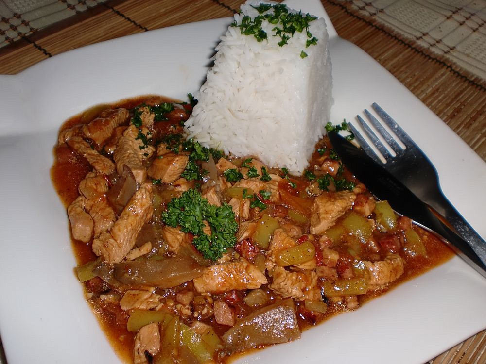 Jako přílohu volíme rýži, hranolky nebo čerstvý chleba.