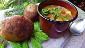 Krok 3: Když je maso měkké, přilijeme k němu cca litr vývaru (případně vody), přivedeme k varu, přidáme jíšku, rozšleháme, opět přivedeme k varu a vložíme brambory nakrájené na kostičky, podušené houby a libeček . Společně vaříme cca 15-20 minut - do změknutí brambor.