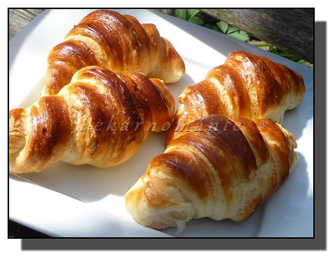 Rozvalujeme raději víc natenko. Z těsta nakrájíme trojúhelníky, které srolujeme za stálého popotahování vrchního cípu, aby bylo na rohlíku vrstev co nejvíc. Krok 5: Rohlíky uložíme na plech, necháme vykynout, potřeme zbytkem rozšlehaného vejce a prudce upečeme (250°C/10min, 200°C/5-8min – každá trouba peče jinak).