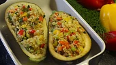 Přidáme hotový kuskus a ještě chvíli necháme restovat. Pak stáhneme z tepla a vmícháme nasekané bylinky, osolíme a opepříme. Krok 5: Vnitřek lilkových lodiček vysušíme a naplníme připravenou směsí. Naskládáme je do pekáčku vymazaného olejem a vložíme do trouby vyhřáté na 200 °C. Pečeme 20 minut. Krok 6: Po této době pekáček vytáhneme z trouby, lilek posypeme nastrouhaným parmezánem a vrátíme ještě na 10 minut do trouby. Výborná příloha jsou rajčata.