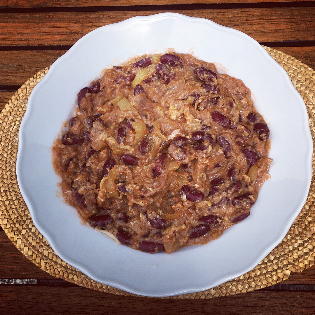 Krok 2: Po změknutí papriky přidáme fazole a kečup (podle chuti). Do této směsi vmícháme dvě vyšlehaná vajíčka (vyšleháme rukou).