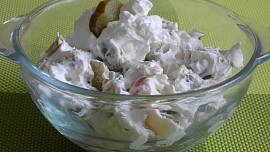 Slepičí maso se výborně hodí na masové saláty. Budete překvapení, jak výborné je v kombinaci s houbami, sladkou kukuřicí a ananasem. Slepice je na tento salát vhodnější než kuře, protože má pevnější maso a v salátu si zachová strukturu.