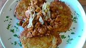 Mezitím uvaříme zelí i s nálevem a vodou. Krok 3: Do hotového masa vhodíme utřený česnek s chilli papričkou a promícháme. Pak slijeme vodu ze zelí a zelí dobře promícháme s masem i šťávou a trochu prohřejeme. Krok 4: Jako přílohu k tomu uděláme bramboráčky. Brambory a cuketu nastrouháme, přidáme vše ostatní a usmažíme na oleji. Krok 5: Místo bramboráčků můžeme podávat s bílým pečivem a nezapomenout na chlazené pivečko!