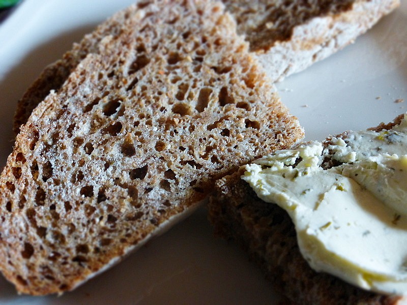 Zároveň s umícháním rozkvasu promícháme všechnu celozrnnou mouku se zbytkem vody a uložíme do lednice (proběhne autolýza, mouka bobtná a zároveň v chladu lednice nekvasí). Krok 2: Aspoň 2 hodiny před vlastním hnětením těsta předmočenou mouku z lednice vyndáme, aby se trochu ohřála. Přidáme k ní pak rozkvas, hladkou mouku, sůl a kmín a uhněteme volné těsto. Krok 3: Stěrkou těsto vyškrábneme na pomoučený stůl a poprvé ho překládáme. Po překládání dáme těsto kynout do olejem vymazané misky. Krok 4: Překládání zopakujeme ještě třikrát, vždy po 30 minutách, pokaždé v už jen v míse – na olejem potřené prsty se těsto téměř nelepí. Po třetím přeložení už vytvarujeme bochníček a ten vložíme na moukou a otrubami dobře vysypanou utěrku a i s ní pak do ošatky, kde ho necháme 1-2 hodiny kynout. Krok 5: Necháme dobře rozpálit troubu i s litinovým hrncem na 250°C, bochník do hrnce pomocí utěrky opatrně skulíme, rychle zakryjeme poklicí a zavřeme troubu. Po 10 minutách pečení poklici sundáme a chleba dopečeme (asi 30 minut).