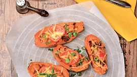Krok 5: Směsí naplníme batáty, dáme na plech s pečícím papírem a pečeme asi 15-20 min na 160°C. Pak posypeme zbytkem sýra a zvýšíme teplotu na 200°na 5 min, aby kůrka zezlátla.