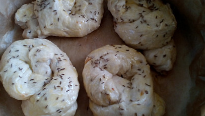 Krok 2: Po nakynutí těsto ještě jednou propracujeme a vytvoříme z něj housky, šneky, uzly..., necháme v teple na plechu s pečícím papírem ještě cca 10 minut kynout nebo je vložíme do remosky (bez kynutí), potřeme rozšlehaným bílkem, posypeme dle chuti solí, kmínem..., zaklopíme a zapneme.