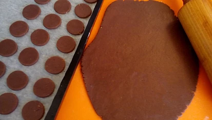 Krok 2: Na pomoučněném stole vyválíme těsto po částech na plát silný asi 2,5mm ze kterého vykrajujeme kolečka, která klademe na plech vyložený pečicím papírem.