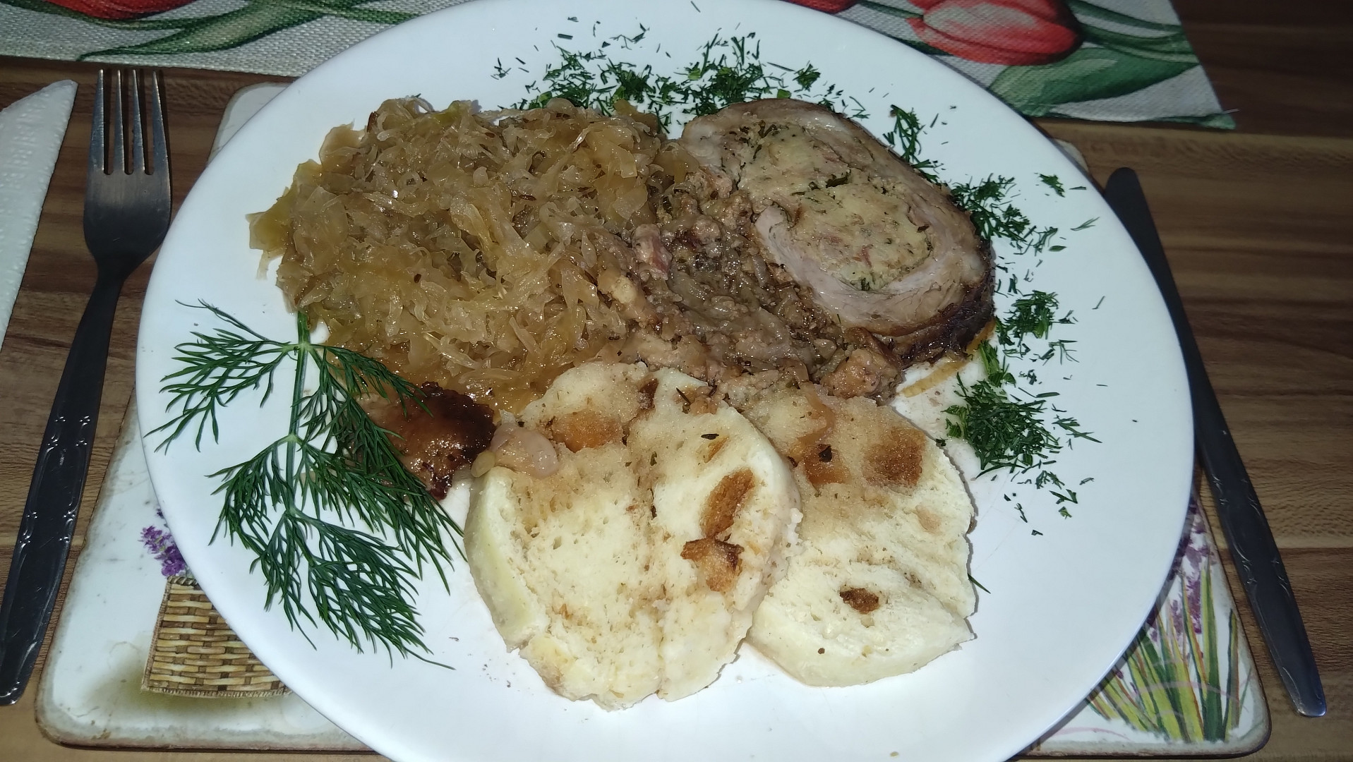 Bůčková roláda klasicky s křimickým dušeným zelím a domácím knedlíkem