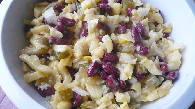 Bramborovo-fazolový salát je jednoduchý a chutný salát plný zdravých surovin, který snadno připravíte z plechovky fazolí, vařených brambor, okurek a cibule. Hořčicový dresink s olejem a okurkovým nálevem mu dodá příjemně pikantní šmrnc.