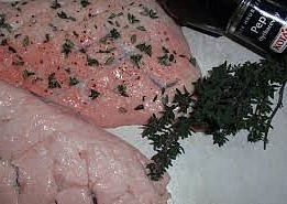 Krok 1: Kachní prsa očistíme, kůži šikmo pokrájíme, ale dáváme pozor, abychom krájeli jen do kůže a neprořezávali se až do masa. Když máme kůži pokrájenou do mřížky, prsa dostatečně opepříme a posypeme lístečky tymiánu.