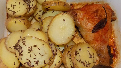 Zapekaciu misu vymastíme olejom a uložíme stehná. Na ne dáme lístky šalvie, podlejeme niekoľkými lyžicami vody, zakryjeme alobalom a pečieme do polomäkka. Krok 2: Potom stehná odsunieme na jednu polovicu misy a na druhú dáme na kolieska nakrájané zemiaky (asi 3 mm hrubé, dobre umyté, ale neošúpané). Zemiaky posypeme rascou, osolíme a pokvapkáme olejom. Vložíme opäť do rúry a nezakryté dopečieme. Krok 3: Na pyré nakrájame hrušku na menšie kocky a so smotanou, šťavou, škoricou a nastrúhaným zázvorom podusíme 5 min. Potom hrušku rozmixujeme dohladka. Krok 4: Stehná podávame so zemiakmi a teplým hruškovým pyré.
