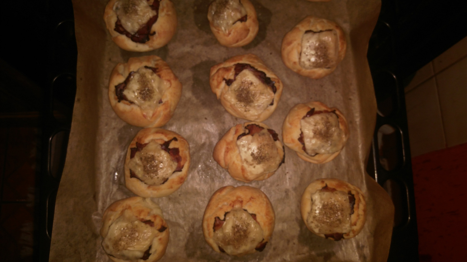 Krok 2: Z hotového těsta vždy odkrojíme malý kousek, uděláme z něj malý bochánek a položíme na plech s pečícím papírem. Až máme plný plech, začneme na jednotlivé bulky dávat slaninu (dle chuti) a na to sýr. Na povrch sýru dáme špetku pizza koření.