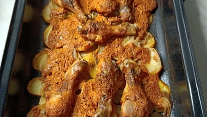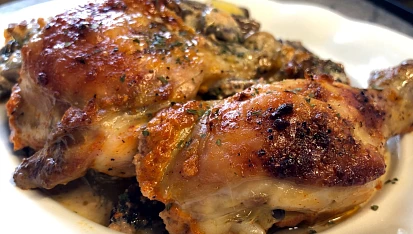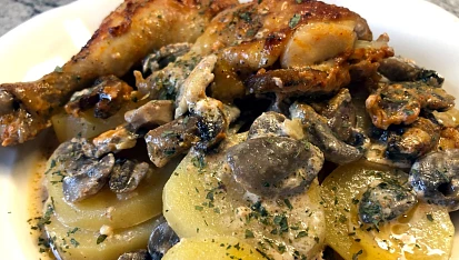 Křehká a voňavá kuřecí stehna pečená na bramborách, pórku a žampionech je velmi jednoduché a chutné jídlo. Recept je snadný - vše se dá péct společně v jednom pekáči do trouby a vy tak jen počkáte, až budete moci servírovat. Dobrou chuť!