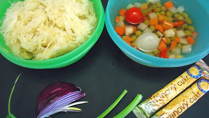 Krok 2: Pokud nemáme domácí nakládanou zeleninu, použijeme z Moravanky spodní část zeleniny (mrkev, celer, hrášek, paprika) a přidáme k zelí. Feferonku již není třeba přidávat, naložená zelenina je lehce pikantní.
