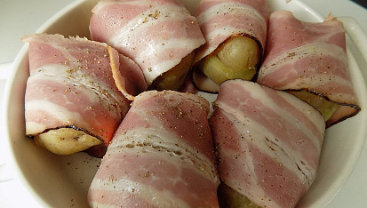 plněné pečené brambory obalené slaninou,
