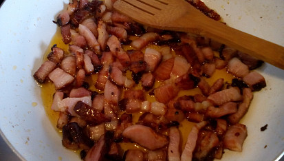 Krok 1: Nejprve z libovějšího debrecínského špeku nebo slaniny sundáme kůži a poté ho pokrájíme na nudličky, které necháme nasucho osmažit v rozpálené pánvi.