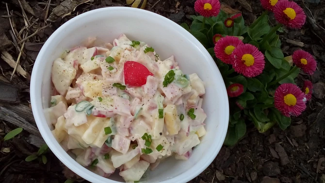 redkvickovy salat, redkvickovy salát recept, salat sunka syr redkvicky, redkvickový salát se sunkou, horácký salát recept, ředkvičkový salát se zakysanou smetanou, ředkvičky recepty, horácký mls, ředvičkový salat se šunkou