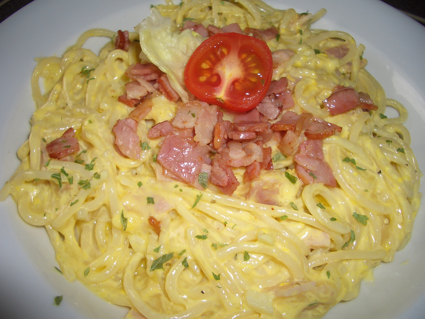 Zahřejeme šlehačku, přidáme utřený česnek, 1 - 2 žloutky, sůl, pepř a tvrdý nastrouhaný sýr. Smícháme s uvařenými špagetami a s drobně nakrájenou šunkou.