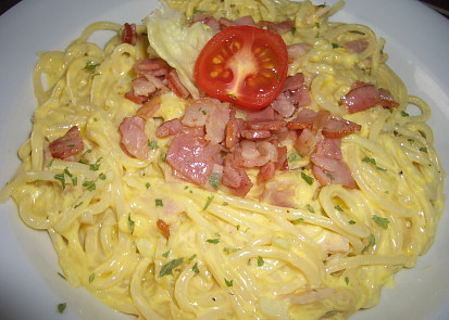 Pokud by někoho zajímalo, jak takové Spaghetti Carbonara vlastně vypadají, tak stačí lepší slanina (originál Guanciale), parmazán a žloutek. Spaghetti uvaříme, smícháme s "vyškvařenou" slaninou (tuk pryč). Parmazán nastrouhaný na prášek smíchat se žloutky. Tento sos je třeba nalít do horké pasty. Buon Appetito -