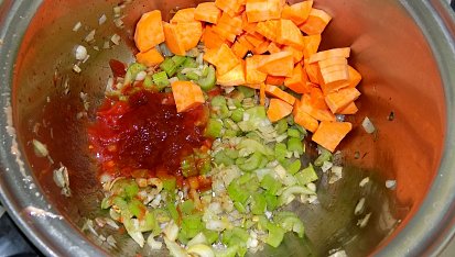 Krok 1: Na oleji orestujeme nadrobno nakrájanú cibuľu. Po chvíľke pridáme nasekaný cesnak, narezený stonkový zeler a nasekanú chilli papričku bez semienok. Osolíme, okoreníme a restujeme asi 3 minúty.