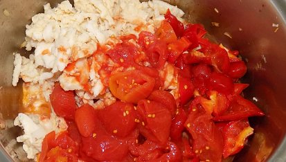 Krok 3: Potom zalejeme vývarom, pridáme na rezance nakrájané papriky, paradajky (ak sú celé, narežeme) a predvarené držky. Podľa chuti dosolíme, dokoreníme a na miernom ohni varíme 30 minút.