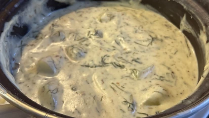 Krok 2: K jíšce za stálého míchání přilijeme mléko, dobře rozmícháme, přivedeme k varu, přidáme sůl, cukr a necháme cca 15 minut provařit, ke konci vaření přidáme jemně nasekaný kopr a po lžičkách dle vlastní chuti ocet.