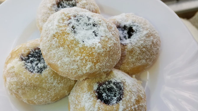 Troubu rozehřejeme na 170 °C. Krok 2: Do mísy dáme mouku, přidáme změklou, na kostky pokrájenou Heru a tavený sýr. Hmotu budeme propracovávat, než nám vznikne nelepivé těsto. Krok 3: Z těsta uděláme váleček a rozkrájíme na špalíky. Vytvarujemez nich kuličky, do kterých uděláme vařečkou důlek. Důlky plníme povidly. Krok 4: Naplněné koláčky klademe na pečicím papírem vyložený plech. Pečeme v předehřáté troubě asi 20 minut. Krok 5: Ještě horké obalujeme ve směsi moučkového a vanilkového cukru.