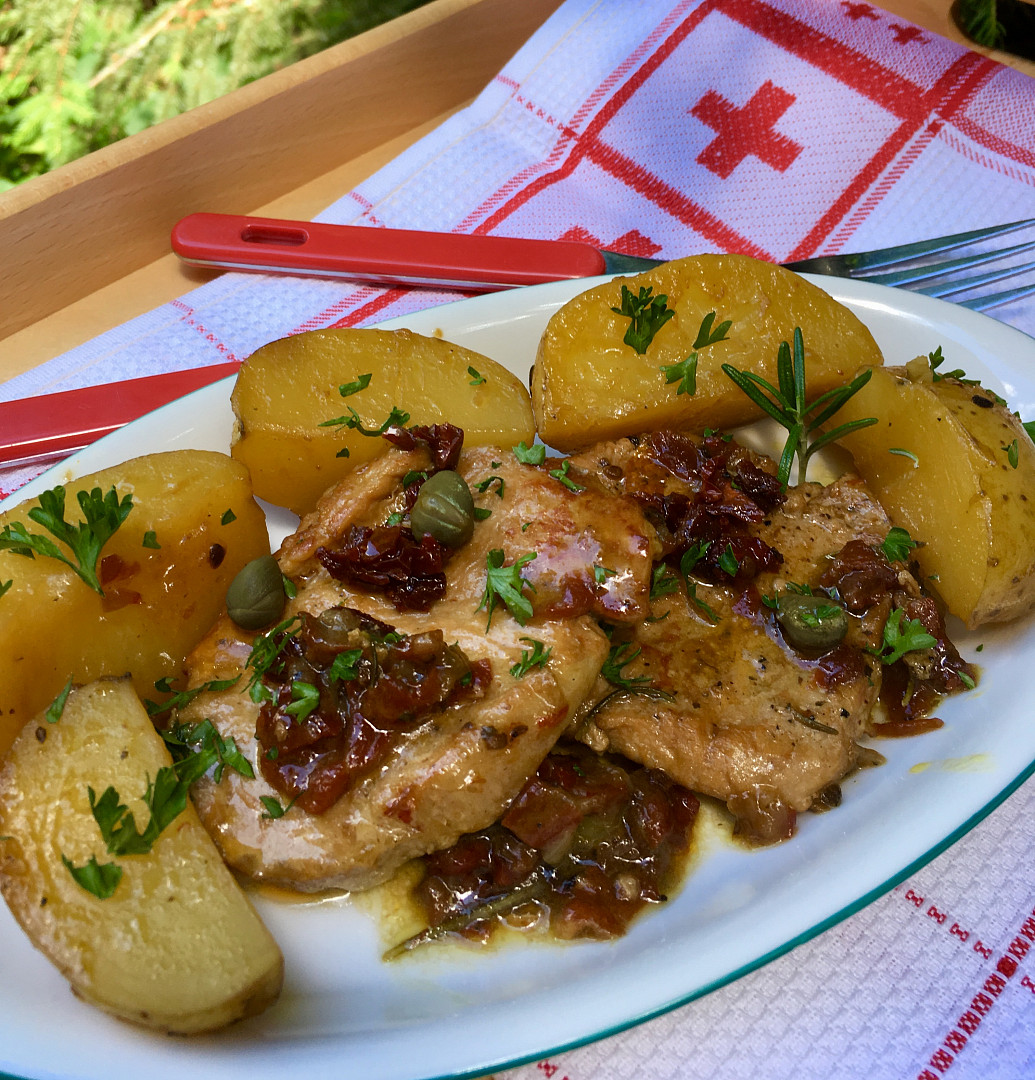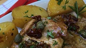 V hlubší pánvi rozehřejeme trochu oleje a maso zprudka opečeme. Vložíme nakrájenou šalotku, krátce orestujeme, přidáme sušená rajčata, rozmarýn, podlijeme vínem, přikryjeme a necháme dusit. Je-li třeba, podléváme vývarem. Krok 2: Když je maso měkké, vložíme kapary a necháme přejít varem. Odstavime z ohně a přidáme lžíci studeného másla.