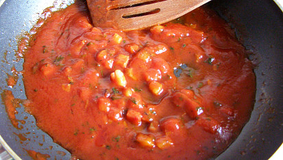 Krok 1: Makaróny uvaříme a mezitím si na pánvi rozpustíme slaninu s máslem a osmahneme jemně nakrájený česnek a petrželku, pak přidáme 2 lžíce protlaku trochu naředěného vodou.