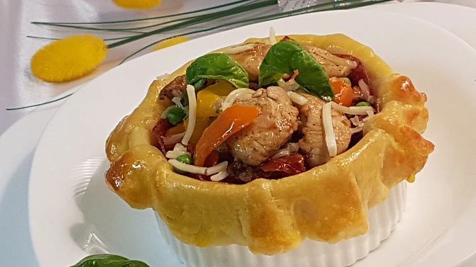 Krůtí kousky se sušenými rajčaty, zapečené v listové misce