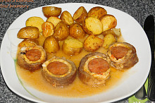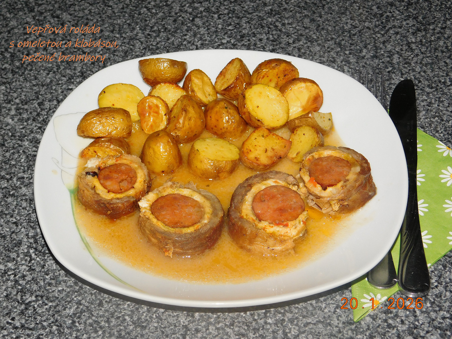 Barevná masová roláda s vaječno-sýrovou omeletou a domácí klobásou