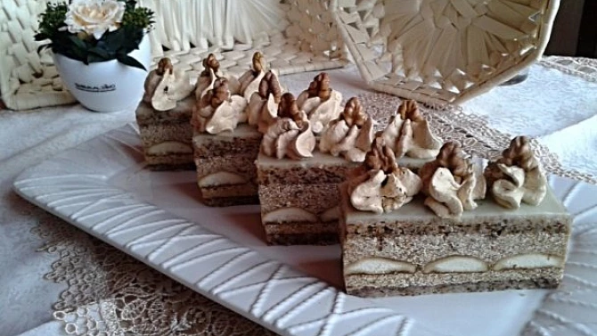Druhý deň som pripravila bielu čokoládovú polevu, koláč som poliala a uložila do chladničky stuhnúť. Šľahačku, cukor a smetafix som vyšľahala a pridala som 1 PL instantnej kávy. Šľahačku som naplnila do cukrárskeho vrecka a ozdobila vrch už nakrájaných rezov. Zdobila som orechmi.