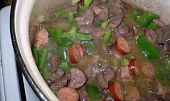 Krok 2: Když se šťáva dostatečně vydusí, přidáme badyán, papriku nakrájenou na proužky, zauzený párek nakrájený na tenčí kolečka, opepříme, osolíme, přidáme vodu a dusíme dál.
